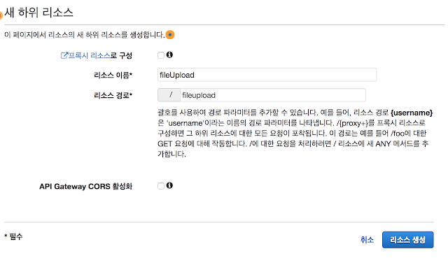 그 다음 API URL에 매칭 될 리소스를 생성합니다. 저 같은 경우는 리소스 명을 fileUpload로 생성했습니다.