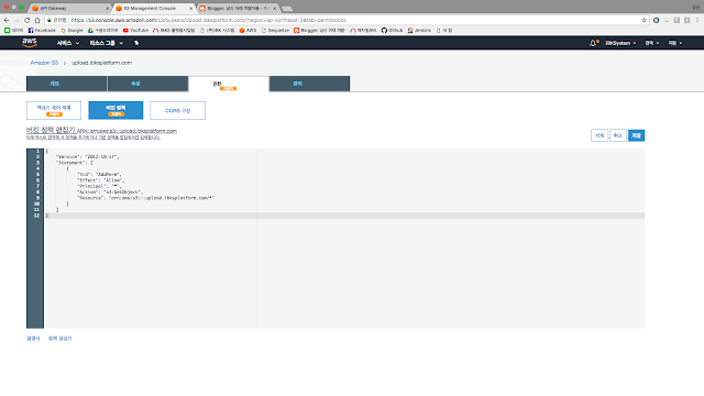 간단하게 설정하자면 버킷 정책은 해당 s3의 모든 정책권한에 대해 허용한다는 것을 의미하고,