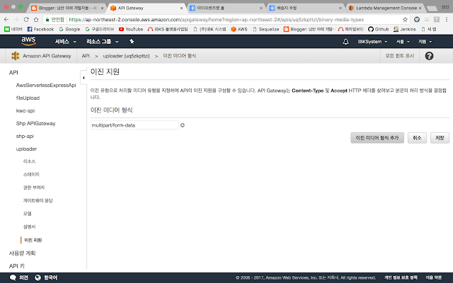 이 이진 미디어를 추가해준 이유는 해당 형식, 즉, multipart폼 형식으로 요청을 보낸 파일들을 API Gateway에서 받으면 자체적으로 파일데이터를 이진 바이너리 형식으로 변환하여 처리해준다는 것을 의미합니다.